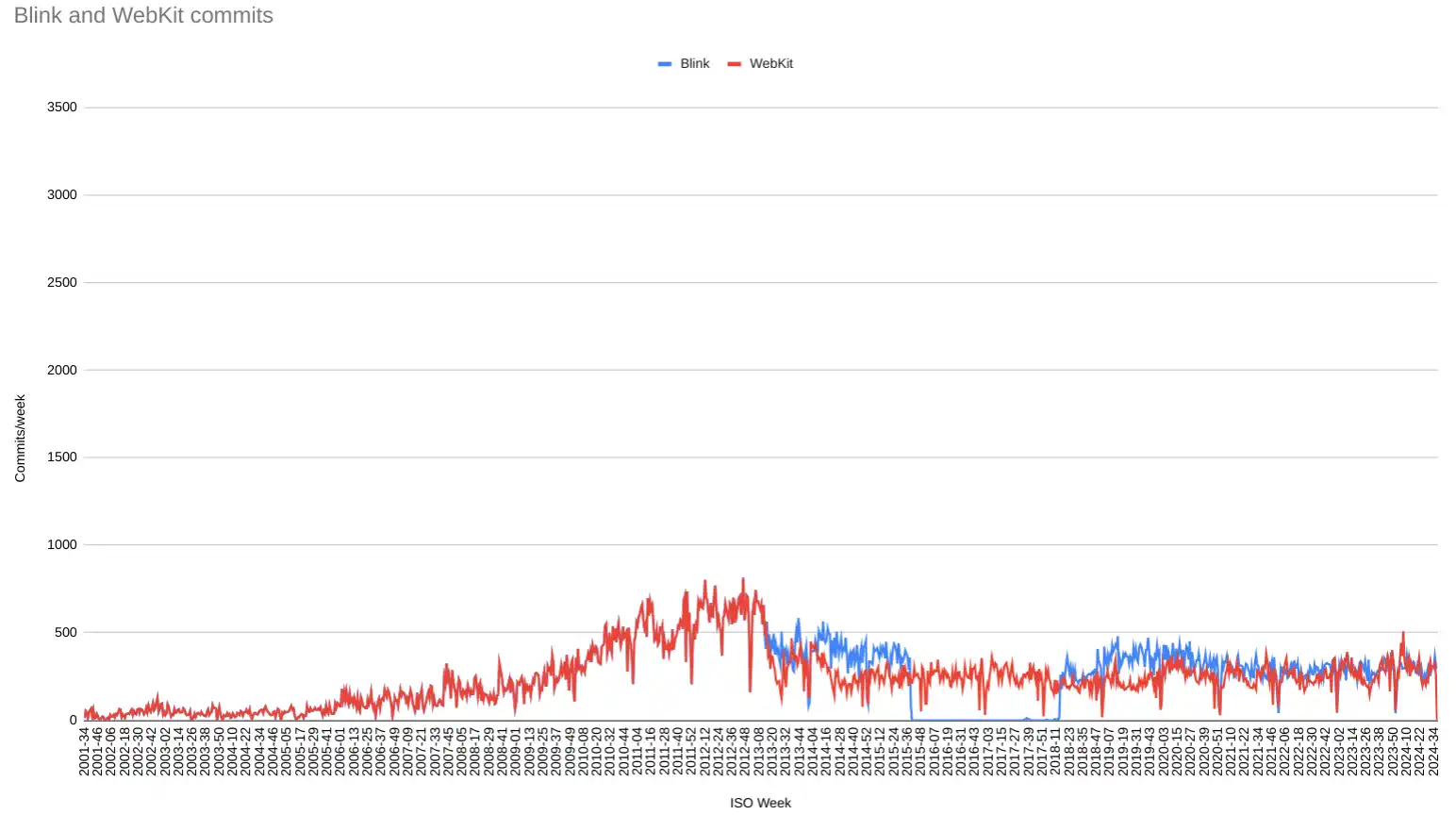 The two lines match up to the fork in 2013. Since they both come from a subversion workflow, they both migrated to a rebase workflow. We can see that on average blink contributions have been a tad higher. It’s the blue line. Still both are within similar ranges, about 300 contributions per week, or 40 per day.